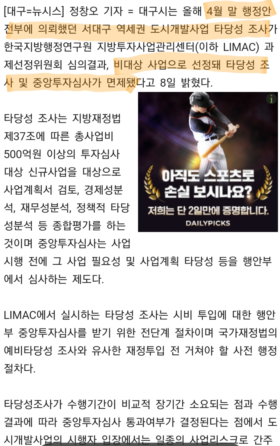 [대구=뉴시스] 정창오 기자 = 대구시는 올해 4월 말 행정안전부에 의뢰했던 서대구 역세권 도시개발사업 타당성 조사가 한국지방행정연구원 지방투자사업관리센터(이하 LIMAC) 과제선정위원회 심
